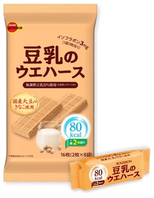 素朴なおいしさで、国産大豆のきなこを使用した香ばしくなつかしさを感じさせるサクサクのウエハースです。栄養成分表はこちら