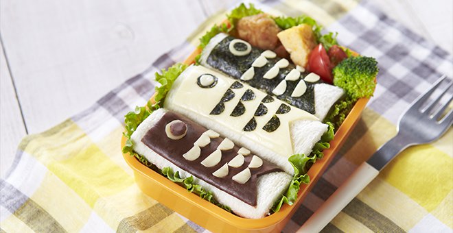 鯉の形に切り取ったのりにスライスチーズで模様をつけたら③の上にのせてラップでくるむ。